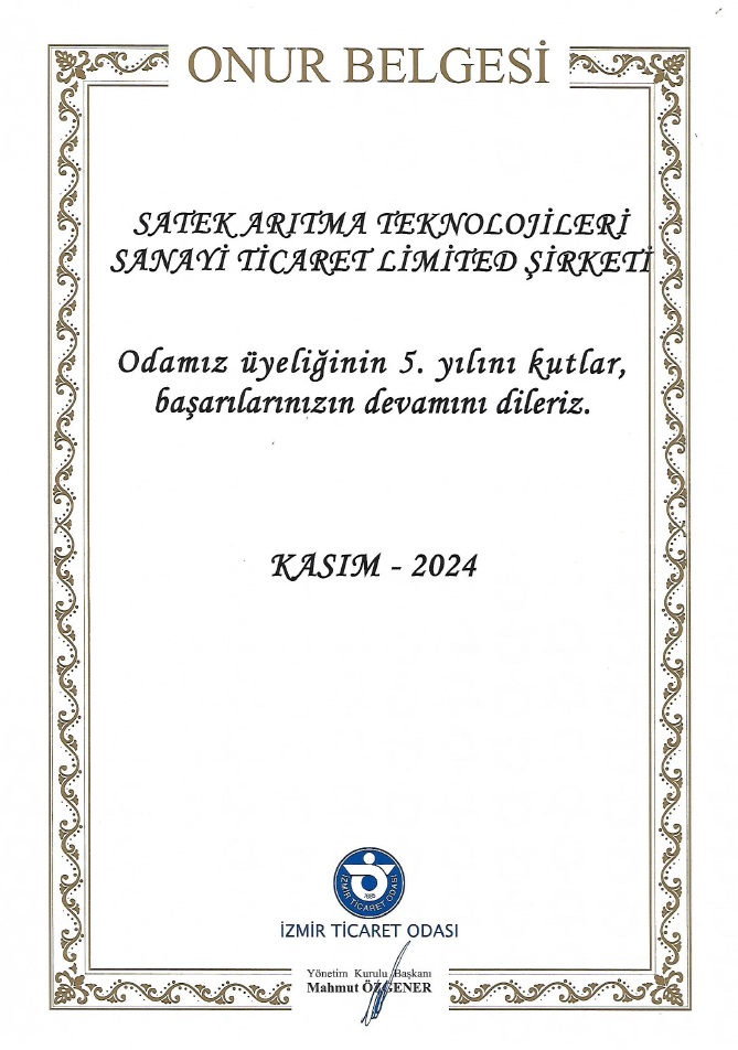İzmir Ticaret Odası üyeliğimizin 5. Yılı dolayısıyla 2024 yılında Satek Arıtma'ya verilen Onur Belgesi