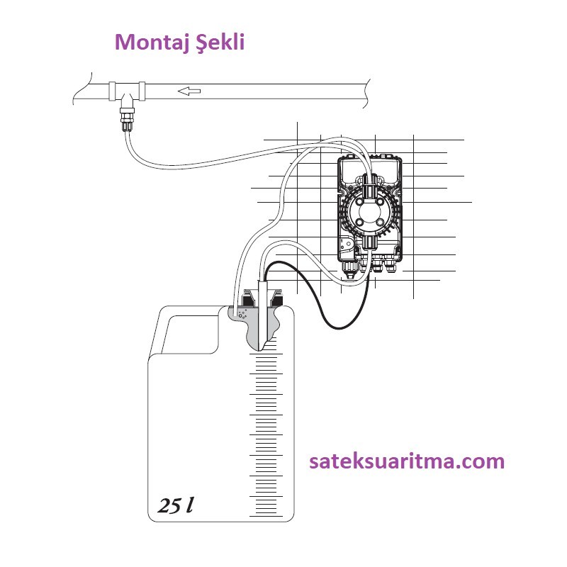 | Montaj Kiti | PVDF-T emme çekvalfi, PVDF-T enjeksiyon valfi, PVC emiş hortumu (2m) , PE basma hortumu (2 m), Duvara montaj aparatı |